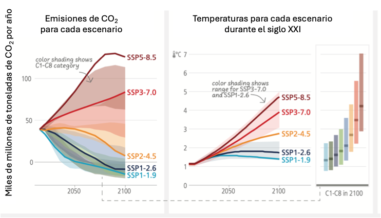 Los escenarios socioeconómicos compartidos (SSPs[13], por sus siglas en inglés), que el IPCC actualizó en su sexto reporte de evaluación (IPCC, 2023), describen las trayectorias posibles de crecimiento, o decrecimiento, de las emisiones de gases de efecto invernadero hacia 2100, lo que dependerá del comportamiento de los diversos factores causales. El reporte considera cinco principales trayectorias posibles, denominadas SSP1-1.9 (muy bajas emisiones, +1.5ºC), SSP1-2.6 (bajas emisiones, +2ºC), SSP2-4.5 (emisiones intermedias, +3ºC), SSP3-7.0 (altas emisiones, +4ºC) y SSP5-8.5 (muy altas emisiones, +5ºC); trayectorias que muestran que hay que ser muy optimistas para aspirar a que la comunidad internacional logre algo mejor que el escenario intermedio